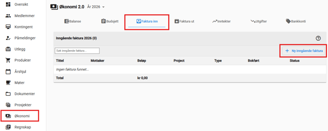 Når foreningen eller sameiet mottar en regning fra en leverandør, registrerer dere denne i Økonomi-modulen under "inngående faktura". En stor fordel med dette er at fakturaen automatisk registreres som en utgift i foreningens regnskap (og under fanen Utgifter).
