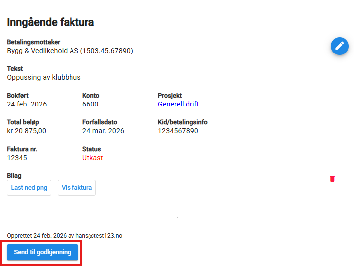 Er alt riktig? Trykk på den blå knappen «Send til godkjenning» nederst til venstre. Det er først nå fakturaen sendes videre til behandling/betaling i