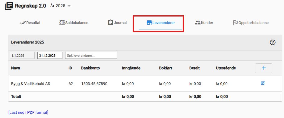 Ønsker du full oversikt over foreningens leverandørreskontro (hva som er fakturert, betalt til hver enkelt og utestående beløp), finner du dette ved å gå til Regnskap > Leverandører i hovedmenyen. (Merk: Denne spesifikke funksjonaliteten for leverandørreskontro krever at organisasjonen har tilleggstjenesten PRO Regnskap eller PLUSS).