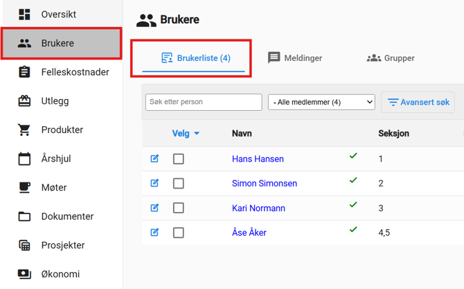 All håndtering av medlemmer gjøres fra medlemslisten. For å finne denne, navigerer du til Brukere i hovedmenyen til venstre, og klikker deretter på fanen Brukerliste.